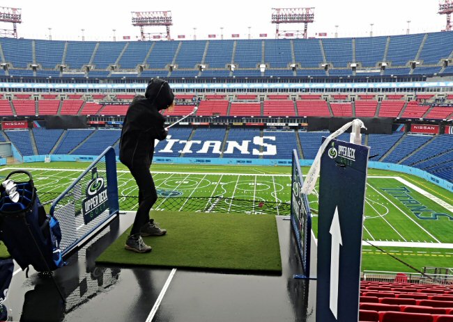 ![]() MCN's Rockin' Rich Lynch looks up as the rain came down at Nissan Stadium. If we hit the designated green that was considered par; off the green was a bogie; within the inner circle around the pin was a birdie; and there was the elusive hole-in-one. Cleveland Golf is the exclusive equipment partner for Upper Deck Golf and they provided clubs for lefties, men and woman/seniors. Although you can bring your own, keep in mind that only 9 and 8 irons are allowed inside.