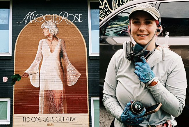 This Taylor Swift mural made national news in April 2024. "They didn't tag me in the reporting," Hall told us when we met up with her outside of Grimey's New & Preloved Music on Thursday, April 25, 2024 when she was finishing up another job on the exterior of the colorful and artistically pleasing music shop on Trinity Lane. The Taylor Swift news story as you would expect went viral. But, in the world of Tik-Tok videos and seconds long soundbites the reporters and networks forgot to credit the artist who can often be seen working alone on a ladder to apply her considerable skill to bring the music to life in a whole new way on Grimey's brick facade. So, we figured we could fix that by shining a little light on Alexandria for the readers of MCN. The personable Alexandria says of herself - "My work contains colorful surreal depictions of our world and the people that inhabit it. I am interested in how small unseen moments can carry hidden messages, emotions, and connections" - making our meeting all the more serendipitous. Hall paints in many fields beyond music including the stunning design she applied to make one basketball court in Atlanta standout. In addition to her gig at Grimey's she is also getting noticed for her collaborations with Disney +, Bandcamp, Pandora Music, Bonnaroo Music & Arts Festival, Mellow Mushroom and many more. While in East Nashville we learned that Hall had just finished up a work for another strong and talented woman - Maggie Rose - who is gaining wider recognition on the strength of her most recent release No One Gets Out Alive. Rose has additionally been spotted on numerous billboards around town and is still often sighted shopping or dining at Roy's Meat Service on 19th Avenue.