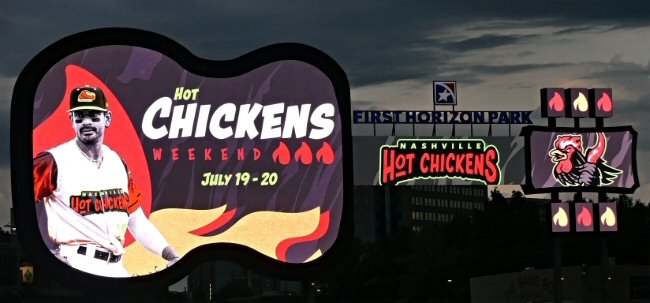 The tastiest weekend on the calendar in Nashville sports takes place at First Horizon Park. This is the third year in a row that Music City's favorite boys of summer have played as the fiery fowls. While we still have trouble understanding how the beloved team mascot Booster is on board with the promotion - he is a giant Rooster after all - we guess that birds of a feather have to stick together. On Friday, Booster was caught canoodling with a fellow employee on the giant guitar-shaped scoreboard in a spoof of this week's Coldplay concert controversy. So, any way you slice it Booster is a team player no matter what's on his plate on Game Day.