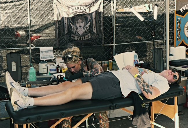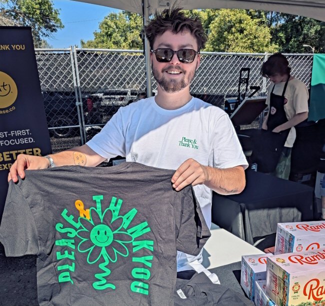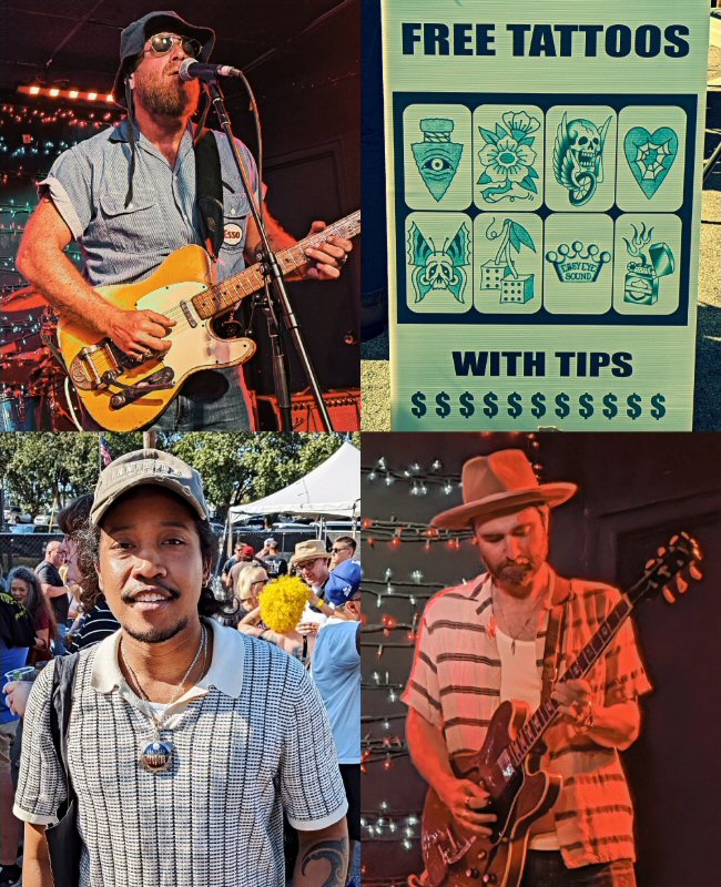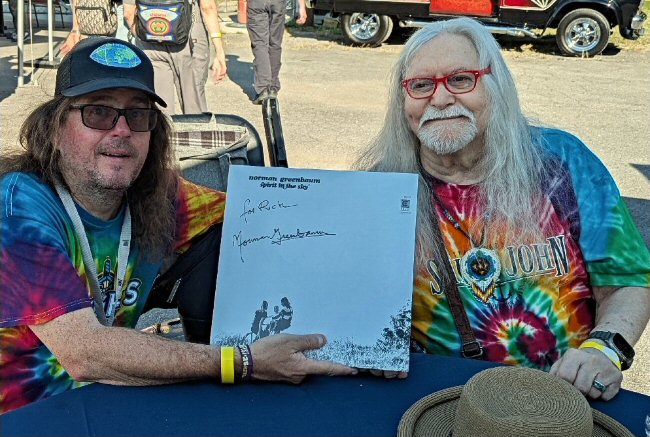Norman Greenbaum gifts Rockin' Rich Lynch his classic album; more fun at the Fish Fry. Beyond the music, the Fish Fry delivered on its namesake with a spread of Southern fare that kept guests fueled and festive. Local vendors and chefs served up crispy fried fish, hushpuppies, pizza and sides that honored the region’s culinary traditions. The laid-back atmosphere encouraged mingling between artists and fans, with picnic tables, string lights, and vintage decor creating a backyard party vibe that felt both nostalgic and fresh. The always popular free schwag and services expanded this year with live T-shirt printing, free tattoos and a professional photo booth that were active all afternoon.