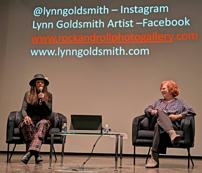 Lynn Goldsmith and Ann Powers converse in Nashville. Goldsmith's photo of the Beatles' suit pants legs and boots was soon published announcing an auspicious start to a career that would last decades and one that is still going strong today. Lynn Goldsmith moved to Nashville in 2018 specifically to provide a "pattern interrupt" in her own life presumably to shake up routine and rattle a rut. She described appyling the same technique to photo sessions with The Police when during particularly tense moments she suggested Sting and the boys wear her wigs in order to change the mood when she thought the band members were on the verge of killing each other. During the 90-minute program the vivacious industry legend went a slightly unusual yet strangely refreshing route admitting to having mostly transactional friendships, being super controlling and highly manipulative in dealing with her high-profile subjects. As an example, she told a story about going against Victory Tour enacted rules to get Michael Jackson to a rooftop position around dusk because that was the "magic hour" and a captive King Of Pop followed her direction and even took off his shirt just as the sun was setting to produce a truly magical photo in the process.