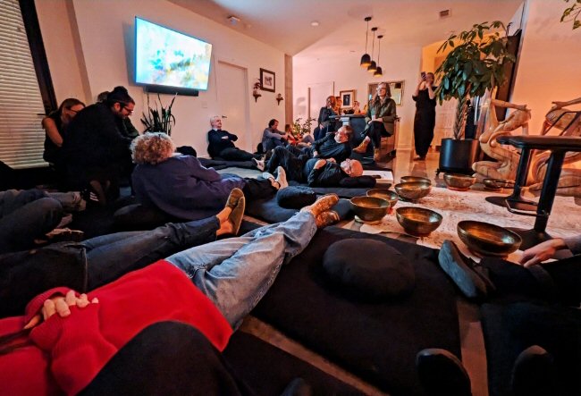 Inside the cozy confines of Haum in Nashville. Industry insiders lounged and flopped on yoga mats and pillows as the 33-minute album made it's public debut. At the conclusion of the playback Ramsey and Broemel emerged to take a seat in front of the captive audience in order to demonstrate their skills in a live setting before doing it all one more time for a fan-friendly show that immediately followed the press preview. Haum in Nashville is a boutique sound‑meditation studio known for its immersive sessions built around crystal bowls, gongs, and other resonant instruments that create a deep, restorative listening experience. Founded by Rebecca Gale, the space blends modern wellness culture with long‑standing sound‑healing practices, offering breathwork, restorative movement, and guided sonic journeys in a calm, atmospheric setting.