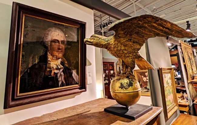 The father of our country and some equally historic birds on display at MCC. One of the many highlights at A&G are their gardens. Cheekwood presented "Entwined Elegance" a living tapestry of azaleas, boxwood hedges and more. The "Eastward Garden" was described as evoking order, elegance and classical inspiration with a nod to tradition, symmetry and refinement. Brought to A&G courtesy of Gavin Duke, Duke Design Group + Gale Higgs, Nashville Landscape Systems. Lastly, "Montauk's Secret Garden" echoed of elegant formal gardens found in the Hamptons. It featured greenery, natural stonework and a handmade English greenhouse showcasing specimen plants. This display was designed by Jerry Trageser + Gavin Normandeau Nature's Best Nursery, Lawn & Landscape Hartley Botanic. The A&G usually has a theme and this year's was "American Elegance" which was well represented at the entrance of the event and throughout the hall where we saw a treasure trove of antiques, fine furniture, garden tools, leather goods, old and new art, outdoor lighting, tornado seats and one-of-a-kind items.