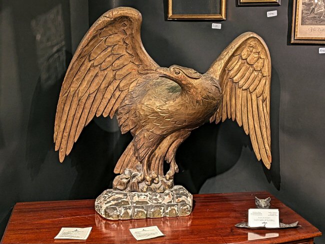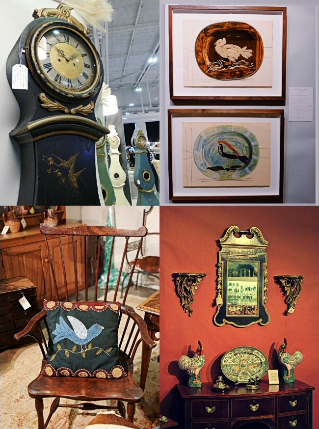 Vintage bird-adorned walking sticks and furniture were around every corner of Exhibit Hall D. We too like to focus on a theme. Last year we looked for cats - this year we went in search of birds which flowed into the idea of soaring which led to discovering a number of inspiring stories as we meandered through all the wonderful wares at A&G. Of course, antiques by nature are often tied to tales of the past or in the modern day how the piece was discovered and possibly brought back to life. Many of the vendors at A&G enjoy sharing their unique journeys along with the history of the items that they are stewarding. Our first uplifting encounter was with VE Designs who specializes in Swedish Mora Clocks. Ella Benton enthusiastically shared with us why the clocks are considered "she" because of their maternal shapes which we had not thought of during past visits to one of our favorite vendors at A&G. Ella mentioned how she first took a liking to these timeless timekeepers and how she would find them for friends. Over time it evolved into VE Designs. The clocks range in age from two to hundreds of years old. They are each hand made and have special features - one even had a circle cut out for a cat to go into while another reflected oriental themes.