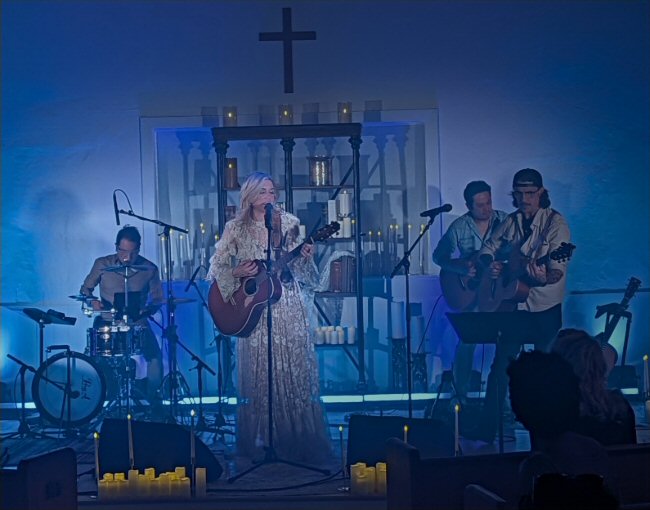 Morgan Myles at Laced record release party in East Nashville. Family and friends gathered and packed the pews of an adorable repurposed tiny brick church house just off of the Gallatin Pike. With pre-party socializing concluded Morgan - looking lovely and appropriately fashioned in lace - took a seat at the piano to present the title track from her much-anticpated album. Laced tackled the toxicity of relationships and how love can leave one broken-hearted. However, much of the record follows Myles' journey to rise above the pain and prevail. For the next track, Morgan armed with an acoustic guitar took center stage. Fellow artists from Chili joined Myles to add rhythm to her riveting prose on "American Sky" - a hopeful declaration that somehow Americans can come back together again. Laced was produced, engineered, and mixed by multi-GRAMMY award winner Ross Hogarth and mastered by Richard Dodd. Myles co-wrote the album with a number of talented writers including Matt Morrisey, David Grissom, Helen Darling, Jeff Cohen, Jeff Trott, Melody Federer, Erik Halbig, Rachel T and Gary Nichols. Gary joined Morgan on stage for a number of tunes including the compelling "How Does That Sound" that showcased Morgan's emotional and expressive range. Myles voiced her concerns that the intimacy of music can be lost in technology adding that songs should be real conversations with soul and she punctuated that point with the somewhat rocking "Rock Bottom" that was penned at the time of her grandmother's passing. "Love Is Lonesome" (Myles/Nichols) offered a poignant view of the emotional distance within love.