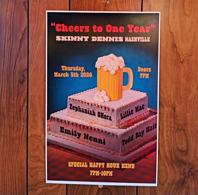 Skinny Dennis - Cheers To One Year! In most cases there is no cover charge at Skinny Dennis so music fans can enjoy quality entertainment for free. Bar and booth seating is available on a first come first served basis. They have a decent size dance floor plus some games. What we liked best was all the vintage items that adorn their walls. They have neon beer signs, beer cans, photos, posters, Tiffany lamps and a number of large items such as a cigarette machine - that if you grew around the time Skinny Dennis was playing bass - was a familiar sight. On Thursday, musical talent for the 1 Year Anniversary Party was provided by Zephaniah OHora, Emily Nenni, Lillie Mae and Todd Day Wait and the venue had a large beer mug shaped birthday cake ready to break out to the tune of "Happy Birthday". Skinny Dennis has the feel of a fun local bar with quality live music. For example, the legendary Jim Lauderdale is scheduled to play there in April - and Chris Scruggs of Marty Stuart's Fabulous Superlatives is also currently hosting a residency there. Just be aware that the venue encourages guests to use rideshare if planning on drinking alcohol plus there is limited on-site parking. However, there is public and paid parking options nearby. Skinny Dennis may have originated in New York, but it most definitely has an old-school Nashville vibe for both locals and tourists to enjoy.