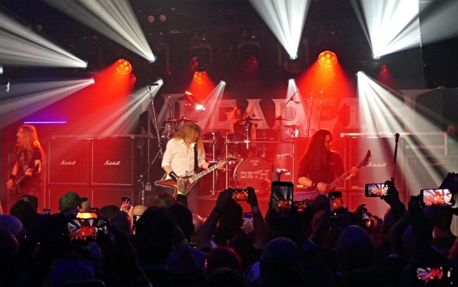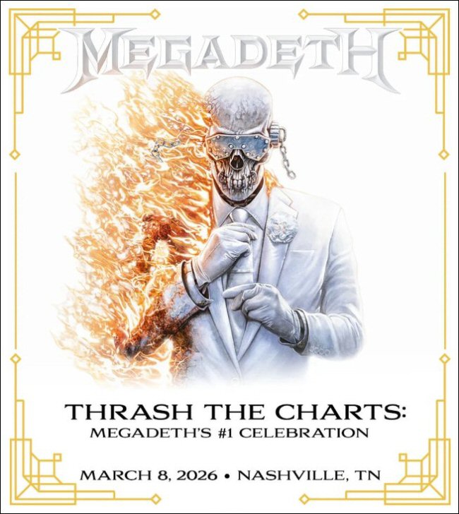 Megadeth re-takes the stage at NOZ Entertainment in La Vergne in March 2026. "Thrash The Charts: Megadeth's #1 Celebration" followed a similar Megadeth themed party called "Let There Be Shred" – The Ultimate Immersive Listening Event for the band's most recent self-titled album held at the same venue last January. In conjunction, Megadeth was formally honored at La Vergne City Hall, where Mayor Jason Cole presented the band with the Key to the City in recognition of their decades‑long cultural impact and their decision to bring a major fan event to the community. "Thrash The Charts: Megadeth's #1 Celebration" was exactly that - it was an exclusive #1 Celebration Party honoring their Billboard Top 200 #1 debut (first ever #1 Top 200 in their career), plus one to celebrate many other #1 Billboard chart debuts in the U.S. an array of #1s worldwide proclaiming the greatness of their bombastic self-titled offering that came out earlier in the year. The once‑in‑a‑lifetime event brought fans closer than ever, delivering an intimate, high‑energy evening celebrating the band's chart‑topping moment.